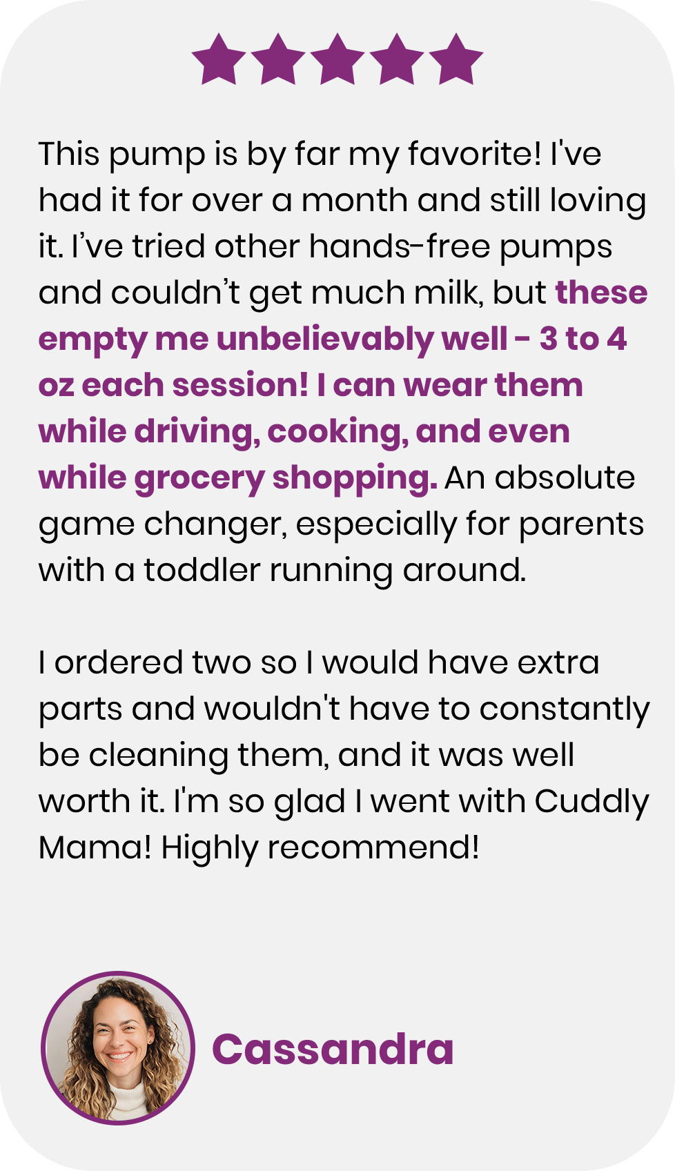 The Cuddly Mama Wearable Breast Pump comes with a 1-year warranty that starts from the date you receive your order. This warranty provides coverage for any defects in materials or workmanship, ensuring that you have a reliable and high-quality product throughout your breastfeeding journey. If anything happens during the warranty period, we are committed to replacing the breast pump with a new one or offering you the option for a full refund. Your satisfaction and peace of mind are our priorities, so you can feel confident and secure in purchasing our product.